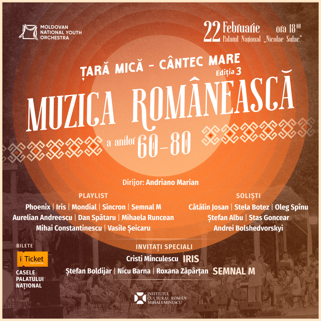 Muzica românească din perioada ’60-’80 va răsuna pe 22 februarie 2025, la Palatul Național „Nicolae Sulac” din Chișinău, în cadrul unei ediții speciale a proiectului simfonic „Țară Mică – Cântec Mare”. Evenimentul, organizat cu sprijinul Institutului Cultural Român „Mihai Eminescu” la Chișinău, va aduce împreună muzicieni renumiți din România și Republica Moldova pentru a celebra melodiile care au marcat o întreagă eră a muzicii românești.